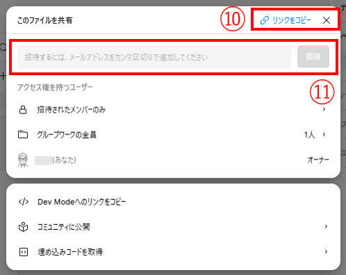 - 「リンクをコピー」をクリックしてURLを相手に伝えます。