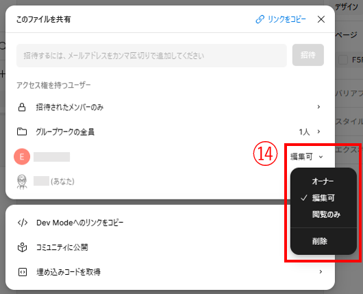 - ファイルに参加しているユーザーが表示されるので「オーナー」「編集可」「閲覧のみ」「削除」から権限を選択します。