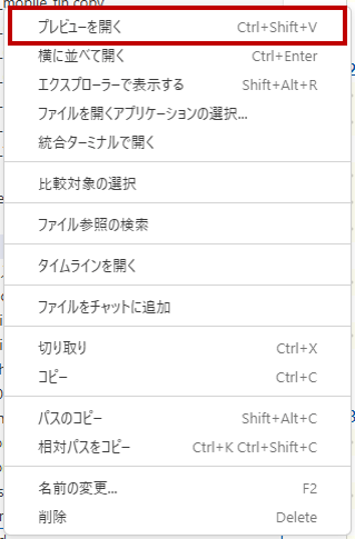 - 左パネル「エクスプローラー」から拡張子「.md」のマークダウンファイルを右クリックします。