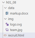 「data」>「markup.docx」ファイルの内容を「recruit.html」にコピーしてください。