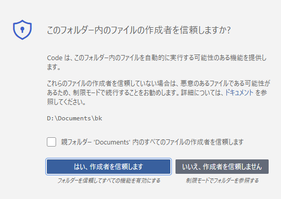以下の画面が表示された時は「はい、作成者を信頼します」をクリックします。